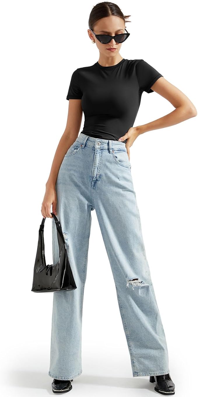 Women Double Lined Fitted Basic Tee Crew Neck Short Sleeve Y2K Crop Top